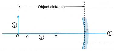 - Step 1: Draw a straight line as the principal axis, curved line as the curved mirror and dotted vertical line at vertex P as the construction line for the curved mirror.