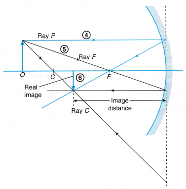 - Step 5: Draw ray F coming from the top of the object. Note that you can also use ray C coming from the top of the object. The top of the image is where any two of the reflected rays meet again after the reflection.