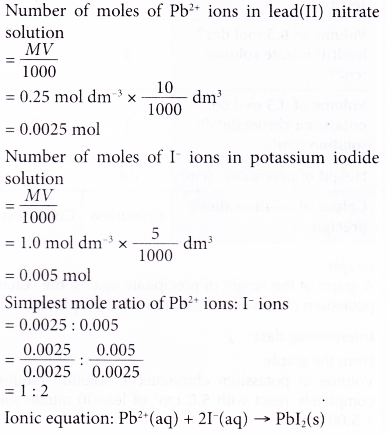 1. 10 cm3 of 0.25 mol dm-3 lead(II) nitrate solution reacts completely with 5 cm3 of 1.0 mol dm-3 potassium iodide solution. A yellow precipitate of lead(II) iodide is formed. Construct the ionic equation for the formation of lead(II) iodide.