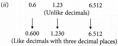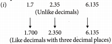 We can convert unlike decimals into like decimals by adding zeros to the right of decimal point or by finding their equivalent decimal.