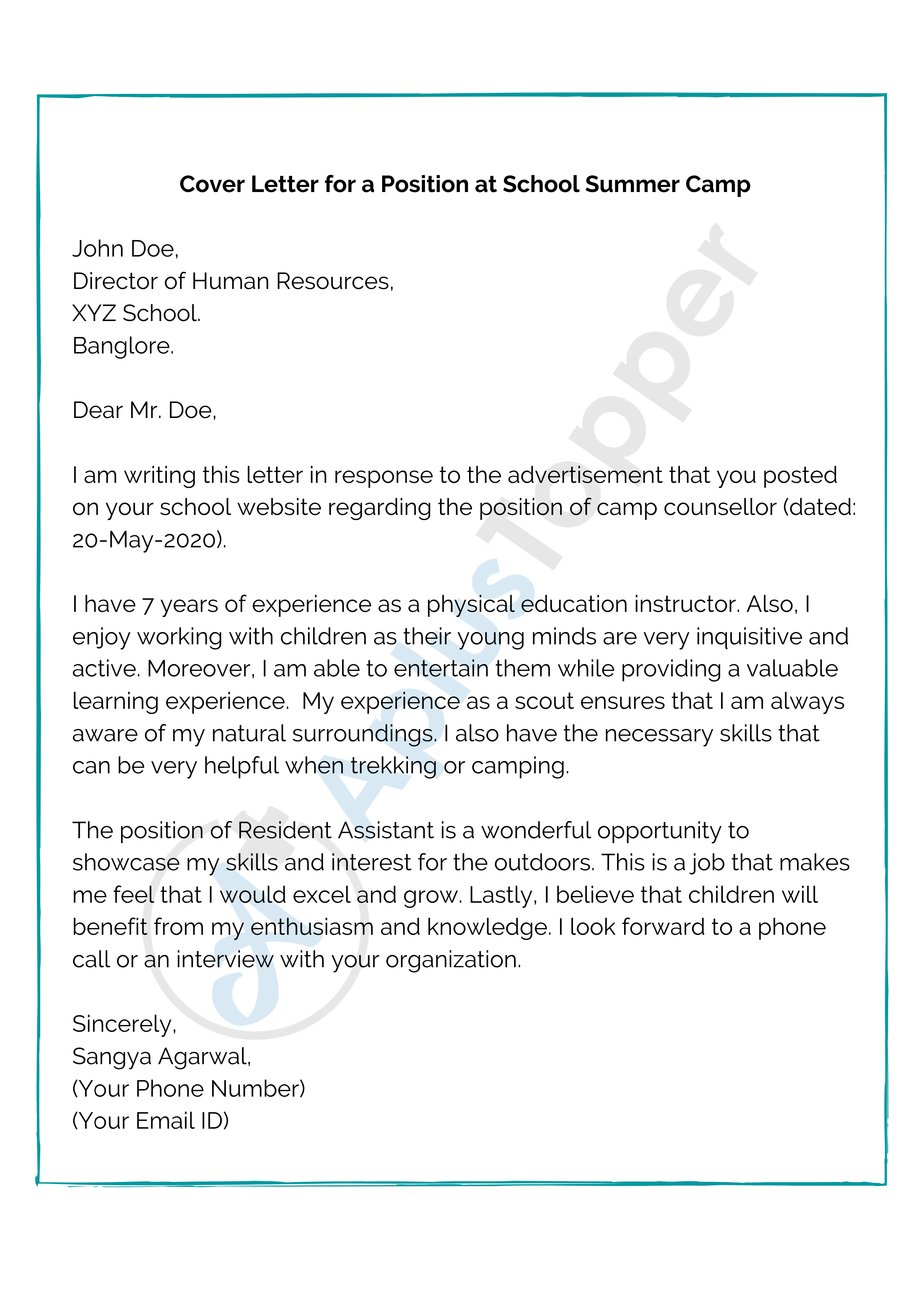 Following is an example cover letter for a summer camp job or a Resident Assistant position (RA).