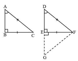 Given: Two right-angled triangles ∆ABC & ∆DEF in which ∠B = ∠E = 90°, BC = EF and AC = DF.