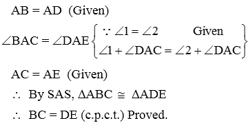 Example 19: In given figure, AC = AE, AB = AD and ∠BAD = ∠EAC. Show that BC = DE.
