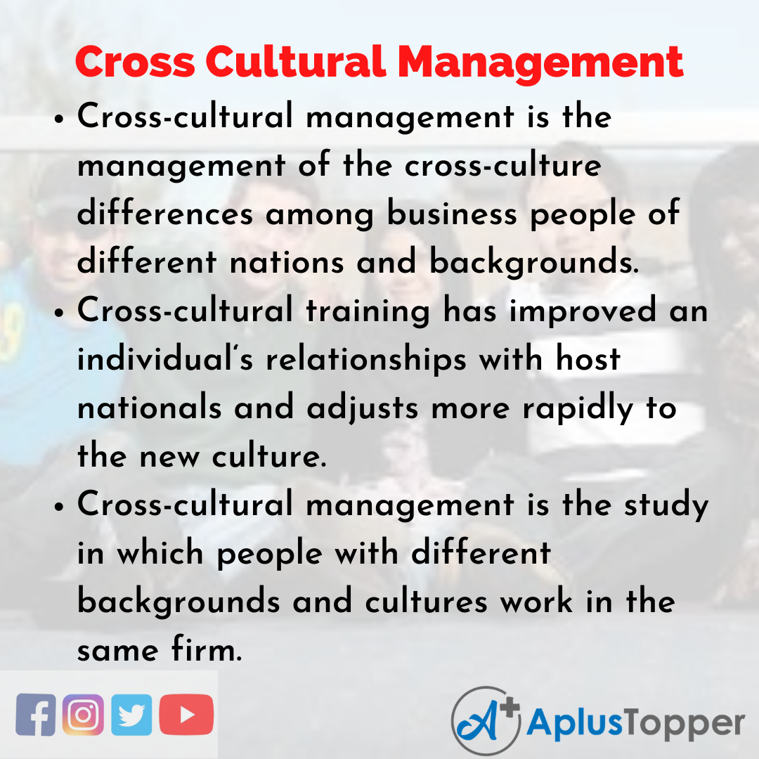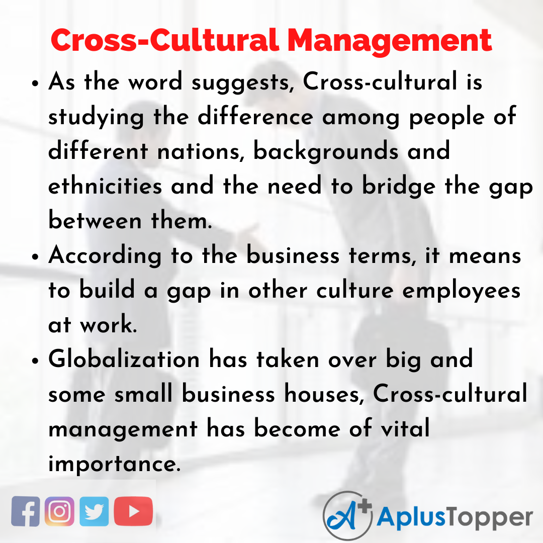 Cross-Cultural Management Essay: Cross-cultural management is the administration’s study to understand the influence of societal culture on managers and management practice and individual managers’ research and the organization’s cultural orientations. There are different length essays on cross-cultural management to guide you in exams, speeches and class projects. I hope you find them useful.