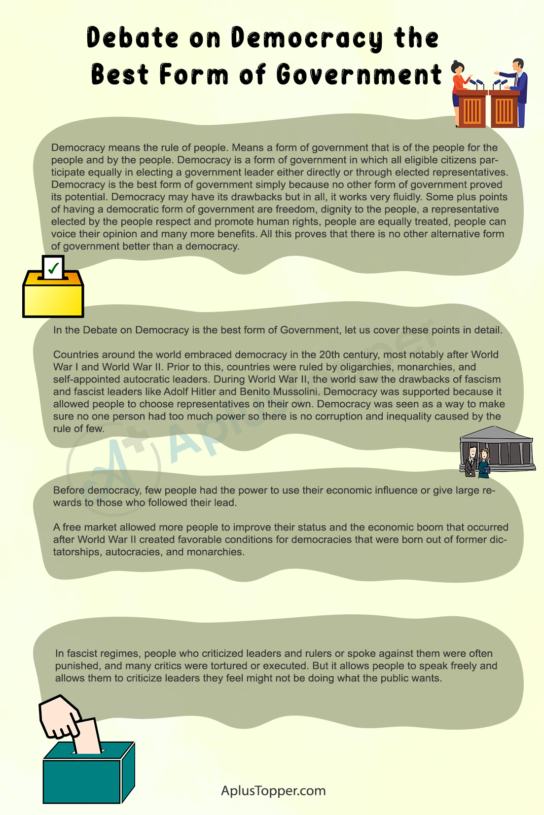 In the Debate on Democracy is the best form of Government, let us cover these points in detail.