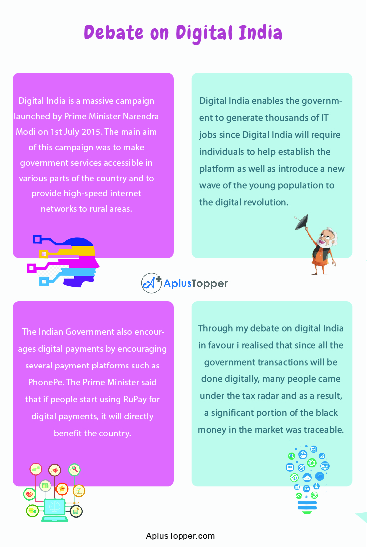 A very Good Morning to the Respected Chief Guest, Honorable Dignitaries, Principal Ma’am, all the Teachers and everyone present here. First of all, I would like to thank Principal Ma’am for giving me the opportunity to participate in a debate on Digital India and express my views. In my opinion, digital India proved to be more beneficial to the country so let me speak in favour of the debate on digital India.