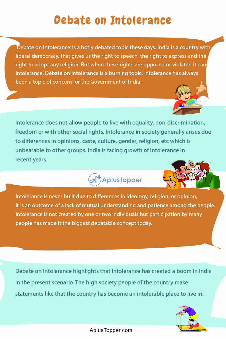 ‘Debate on Intolerance’ is a hotly debated topic these days. India is a country with liberal democracy, that gives us the right to speech, the right to express and the right to adopt any religion. But when these rights are opposed or violated it causes intolerance. Debate on Intolerance is a burning topic. Intolerance has always been a topic of concern for the Government of India.