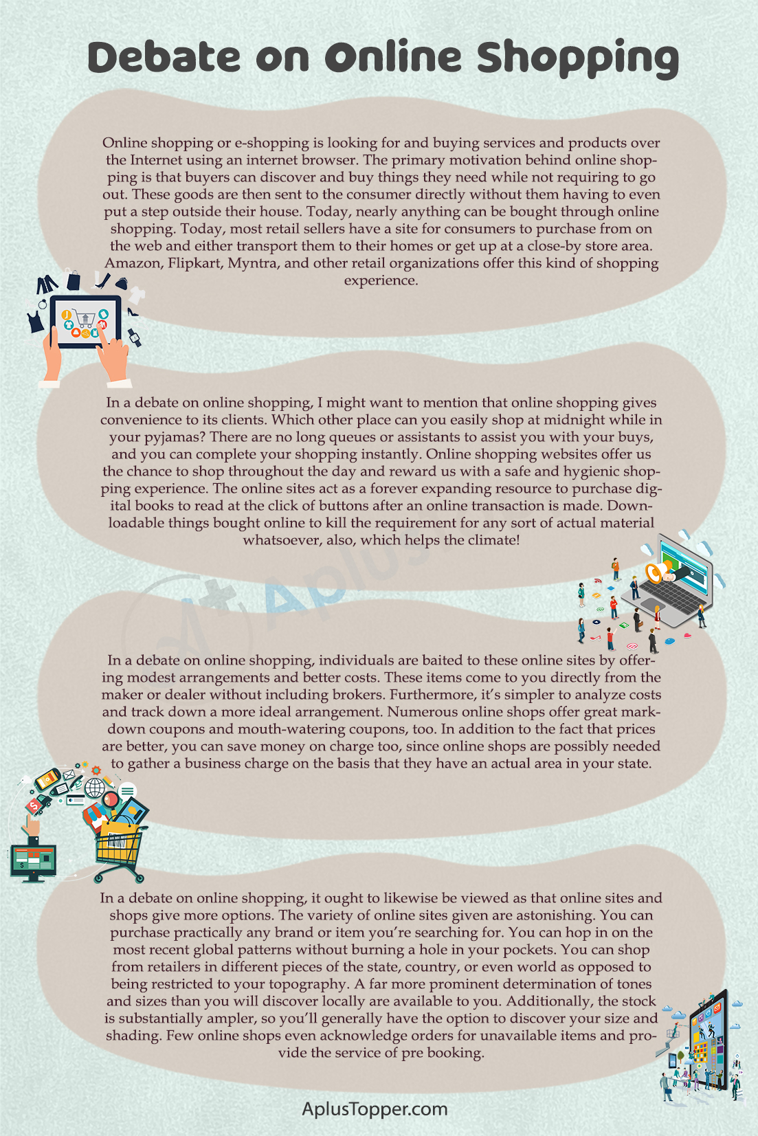 Debate on Online Shopping: Online shopping or e-shopping is looking for and buying services and products over the Internet using an internet browser. The primary motivation behind online shopping is that buyers can discover and buy things they need while not requiring to go out. These goods are then sent to the consumer directly without them having to even put a step outside their house. Today, nearly anything can be bought through online shopping. Today, most retail sellers have a site for consumers to purchase from on the web and either transport them to their homes or get up at a close-by store area. Amazon, Flipkart, Myntra, and other retail organizations offer this kind of shopping experience.