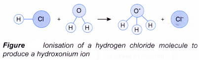 - Hence, the ionisation of hydrochloric acid in water can be represented as:
