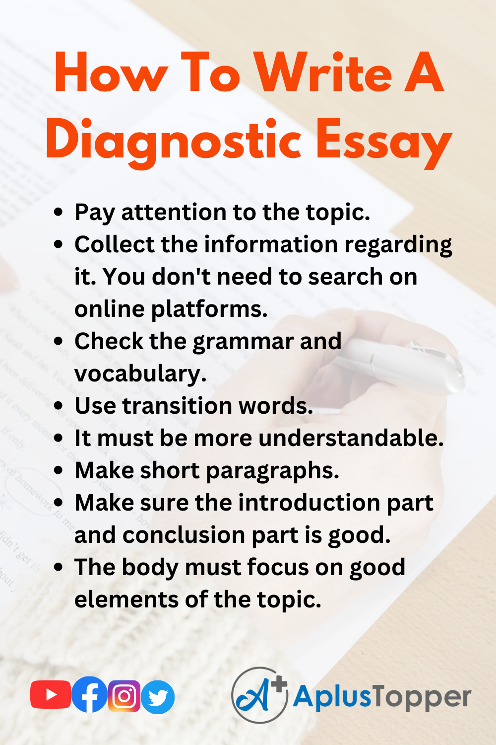 Most of the persons don’t know what is a diagnostic essay. How to write a diagnostic essay? Purpose of the diagnostic essay? For that people, the aplustopper.com website wants to provide some focus points required for writing the best diagnostic essay for beginners and experts in an excellent manner. Let’s see what are those. The focus points are included under the head of how to write a diagnostic essay.