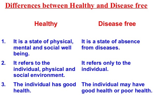 | 3. A ‘healthy’ individual is one who is able to perform normal under given situation. | 3. A ‘disease-free’ individual may have good health or poor health |