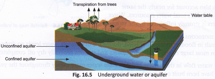 Rainwater seeps through topsoil and layers of rocks like limestone, sand and gravel, and gets collected on top of non-porous layers. The top level of this underground water is called the water table. Underground water is also known as an aquifer.