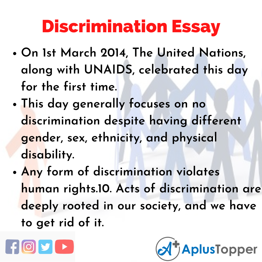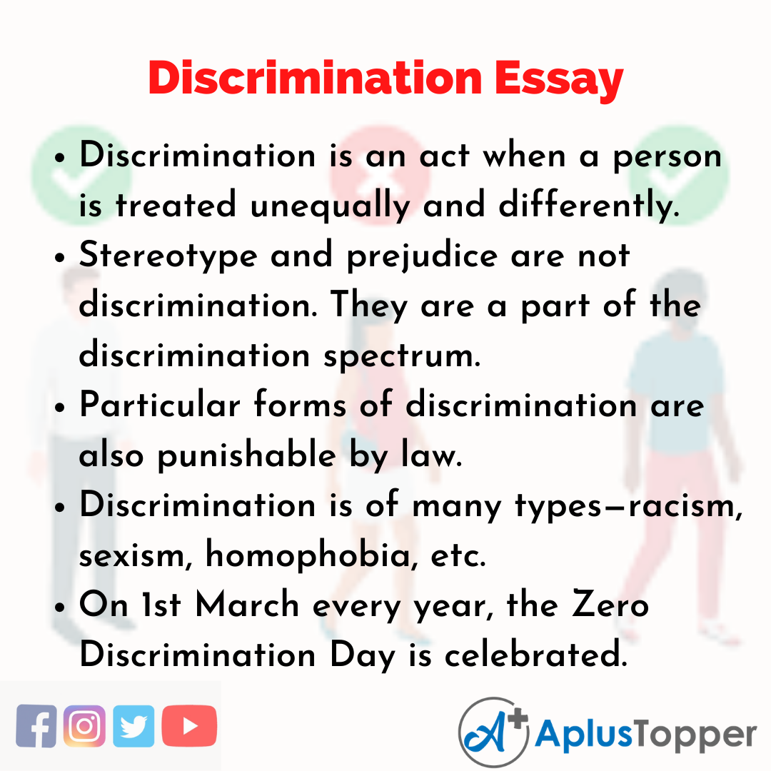 Discrimination Essay: According to the Oxford dictionary, discrimination is the practice of treating an individual or a particular group in society unfairly than others based on age, race, sex, religion, finance, etc.