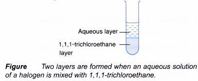 - This is done by mixing thoroughly 1,1,1-trichloroethane to an aqueous solution of a halogen. Two layers will be formed whereby the denser 1,1,1-trichloroethane layer will be at the bottom and the less dense aqueous layer will be at the top.
