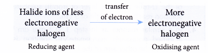 - The halide ions of the less electronegative halogen act as the reducing agent. They lose their electrons and are oxidised to form halogen molecules.