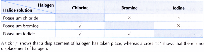A more electronegative halogen can displace a less electronegative halogen from its halide solution whereby the more electronegative halogen acts as the oxidising agent and the halide ions of the less electronegative halogen act as the reducing agent.