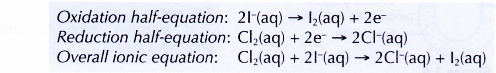 (b) chlorine displaces iodine from potassium iodide solution. Chlorine acts as the oxidising agent, whereas iodide ions act as the reducing agent.