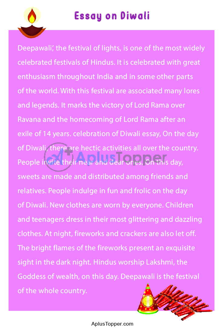 celebration of Diwali essay, On the day of Diwali, there are hectic activities all over the country. People invite their near and dear ones. On this day, sweets are made and distributed among friends and relatives. People indulge in fun and frolic on the day of Diwali.