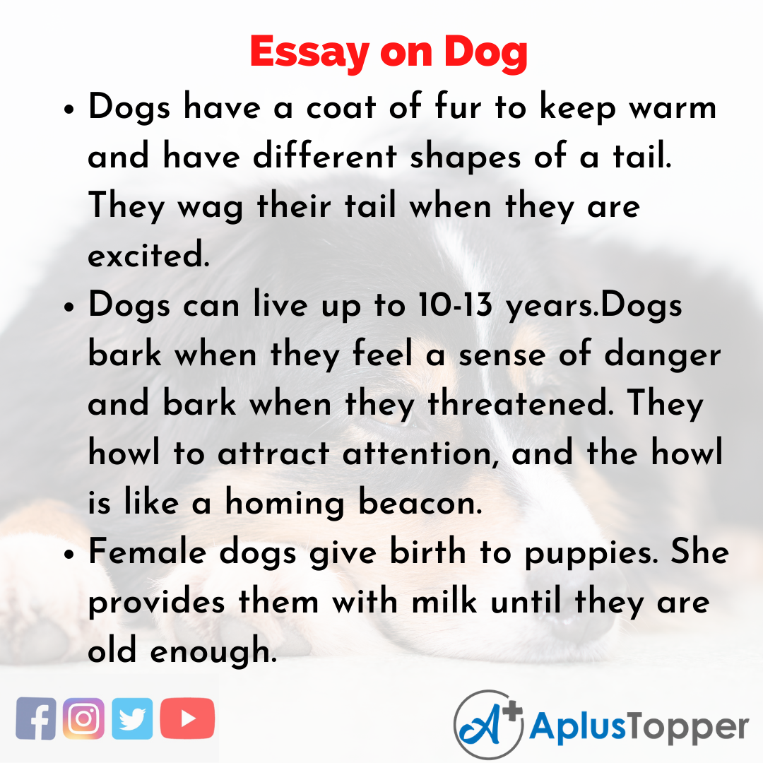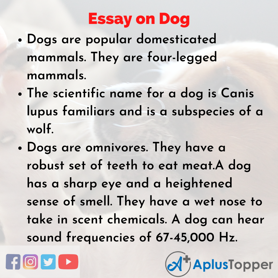 Dog Essay: A dog is a domestic animal and a popular companion or pets among humans. Dogs are mammals, and their scientific name is Canis lupus familiaris. Dogs are omnivores as well. Dog and man have been companions for almost 40,000 years and is a tamed animal. Dogs are said to be very loyal to their owners and make sure that they are safe at all times.
