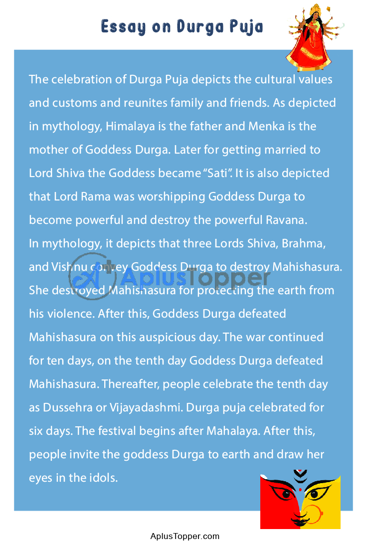 The celebration takes place for ten days by tradition. The last four days of the festival that is Saptami, Ashtami, Navami, and Vijayadashami are celebrated with great enthusiasm and belief. The celebration of Durga Puja depicts the cultural values and customs and reunites family and friends. This year, Durga Puja will be celebrated from 4th October to 8th October, till the immersion of the idol. Essay on Durga Puja in 1000 words.