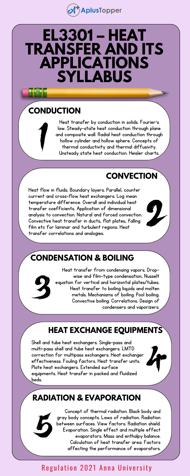 We aim to give the semester III EL3301 – Heat Transfer and its Applications Syllabus to avoid confusion about the unit-wise syllabus. You can take notes from it. And Prepare strategies on how to read, from where to read, etc… It will become easy to learn about several topics. We included the required references and textbooks. Hope this information is useful. If you have any doubts regarding the syllabus please comment below. Never forget to share with your classmates.