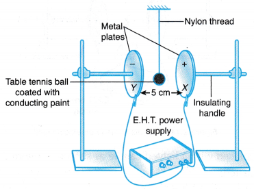 - A table tennis ball coated with a conducting metallic paint is hung between two metal plates with a nylon thread (as an insulator) as shown in Figure 2.12.