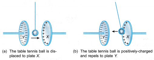 - The ball is then displaced to any of the plates, as in this case plate X. When the table tennis ball touches plate X, it is charged with positive charges and repels towards plate Y. See Figure (b).