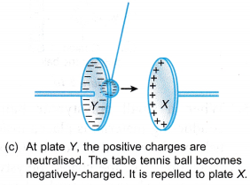 - When the ball touches plate Y, the positive charges are neutralised by negative charges. The ball is then negatively- charged and repels towards plate X. See Figure(c). The process is repeated and the ball oscillates to and fro between metal plates X and Y.