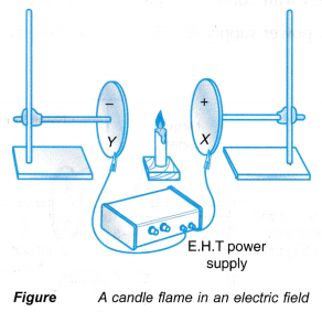 - When the E.H.T. power supply is switched on, the candle flame splits into two portions in opposite directions. The portion that is attracted to the negative plate Y is very much larger than the portion that is attracted to the positive plate X. See Figure.