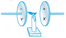 - When a small polystyrene ball coated with conducting material is placed inside the electric field produced by the two parallel plates as shown in Figure, the coated polystyrene ball will move towards the positively-charged plate when displaced slightly to the left. It sticks to the plate momentarily and then repels towards the negatively-charged plate.