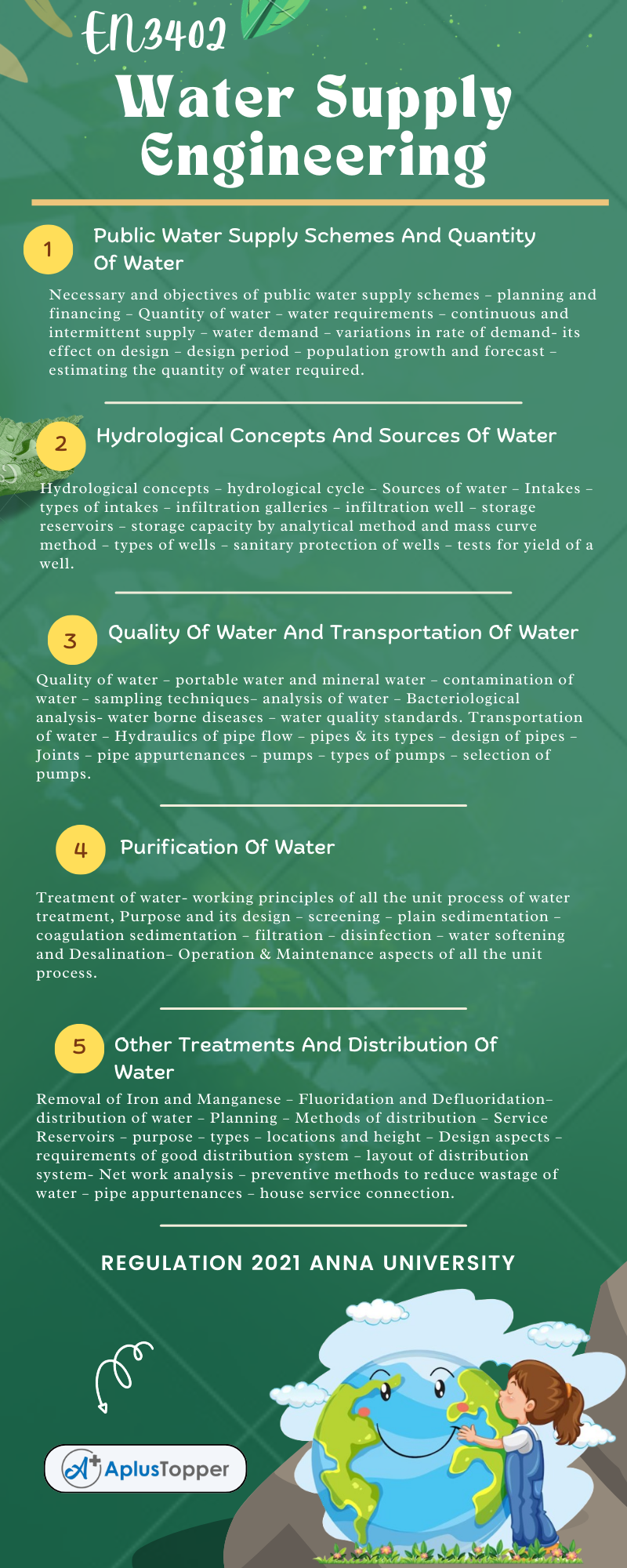 We aim to provide a detailed syllabus of EN3402 Water Supply Engineering Syllabus. You can find unit-wise concepts and can easily make your preparations for examinations. It wouldn’t be difficult to find all the requirements in one place for the subject syllabus. This motto makes us provide this information to make it easy for you. Hope this information is useful. Don’t regret to share it with your classmates.