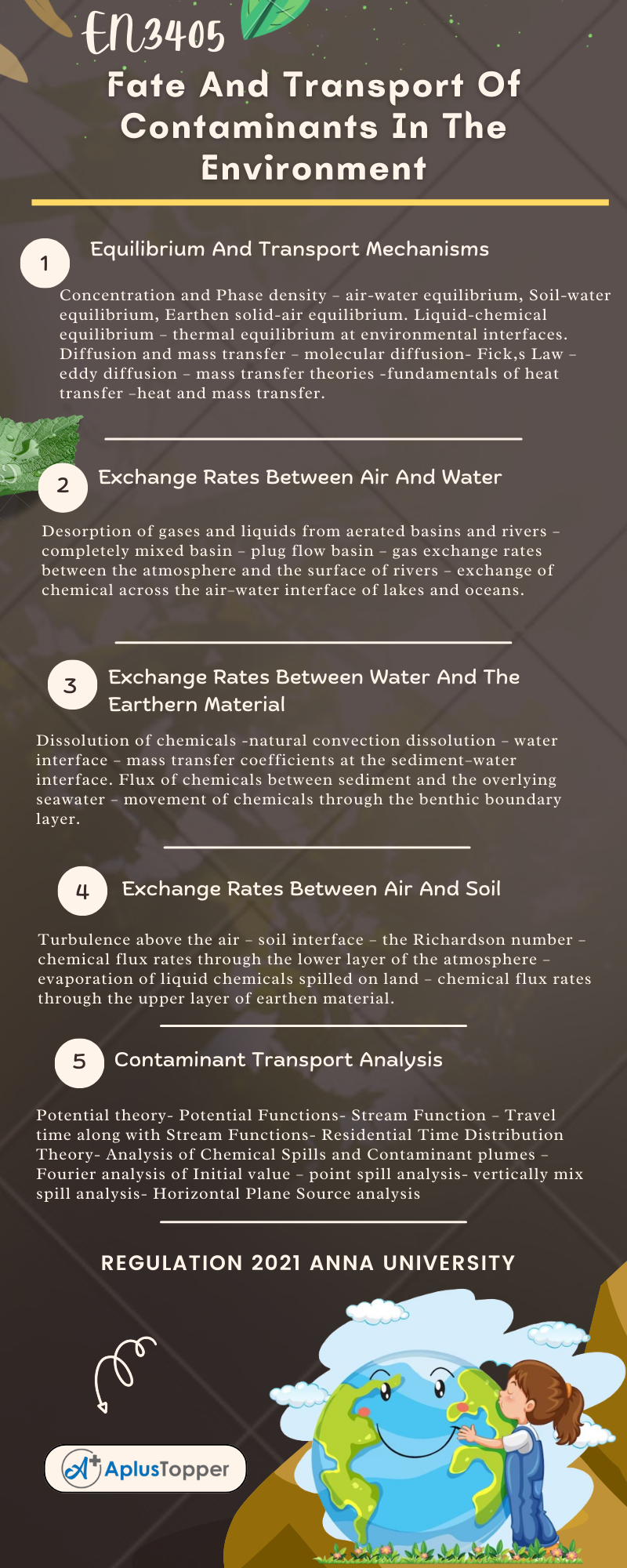 We aim to provide a detailed syllabus of EN3405 Fate And Transport Of Contaminants In The Environment. You can find unit-wise concepts and can easily make your preparations for examinations. It wouldn’t be difficult to find all the requirements in one place for the subject syllabus. This motto makes us provide this information to make it easy for you. Hope this information is useful. Don’t regret to share it with your classmates.