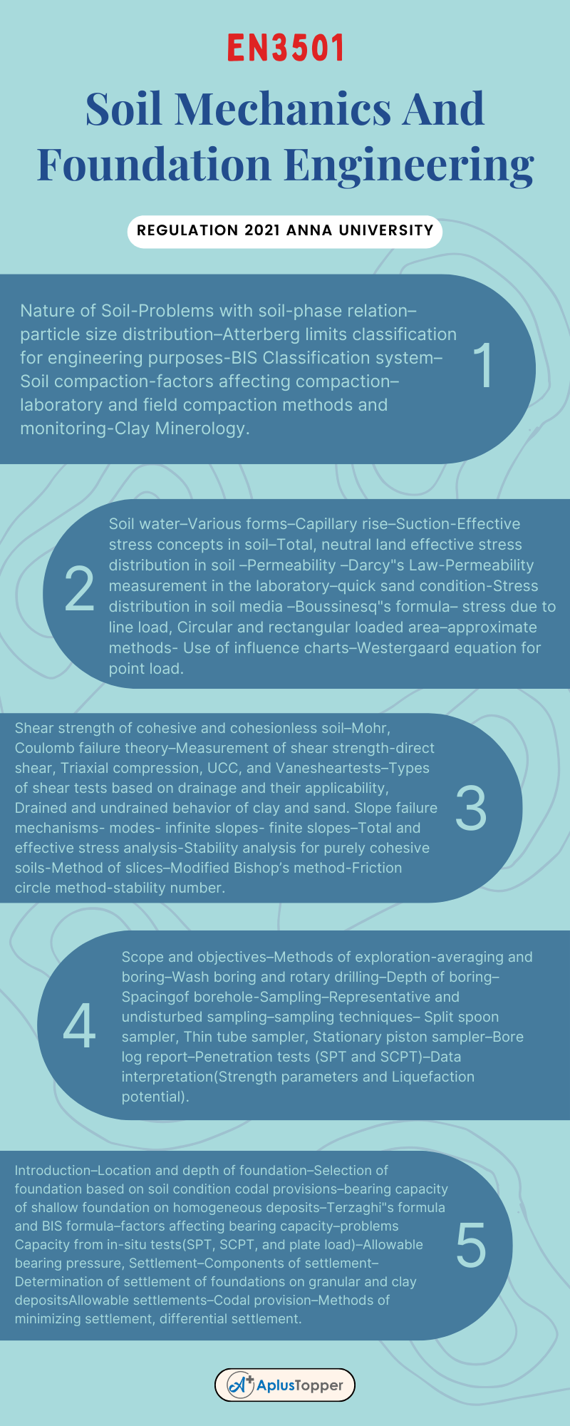 We aim to provide a detailed syllabus of EN3501 Soil Mechanics And Foundation Engineering. You can find unit-wise concepts and can easily make your preparations for examinations. It wouldn’t be difficult to find all the requirements in one place for the subject syllabus. This motto makes us provide this information to make it easy for you. Hope this information is useful. Don’t regret to share it with your classmates.