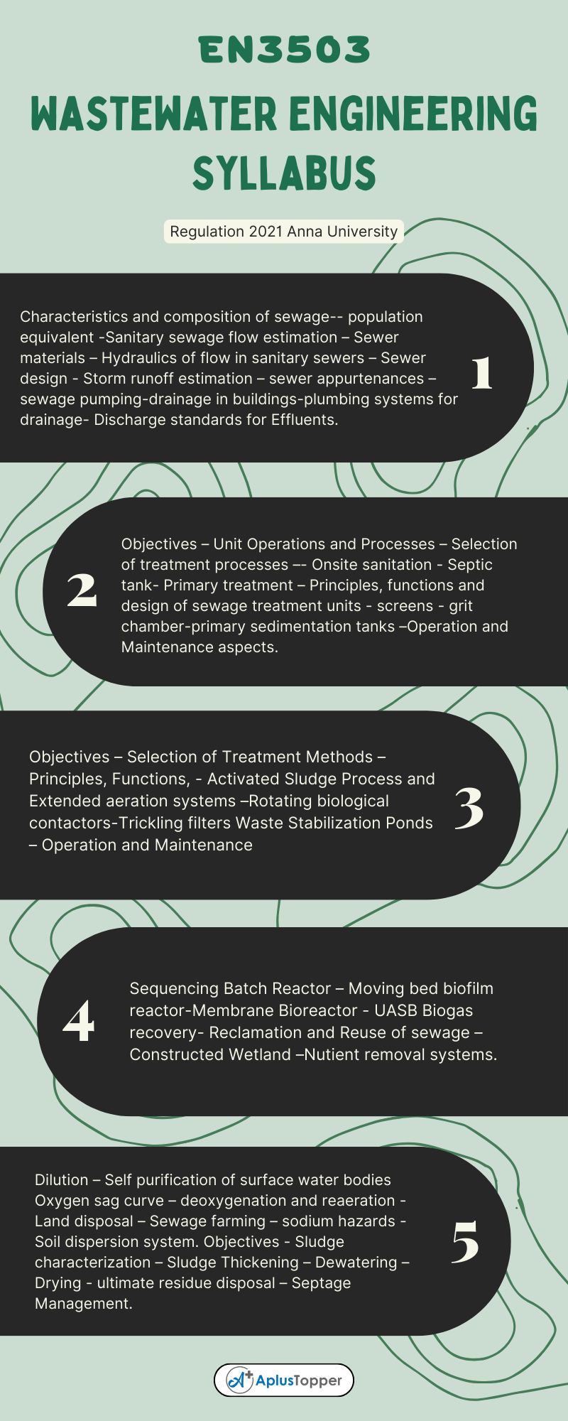 EN3503 subject code deals with the Wastewater Engineering syllabus of B.E Environmental Engineering. In the second year, it is included in the semester V. This subject deals with the statistics and probability concepts to explore. In this article, we include textbooks and references to guide you to some more extent.
