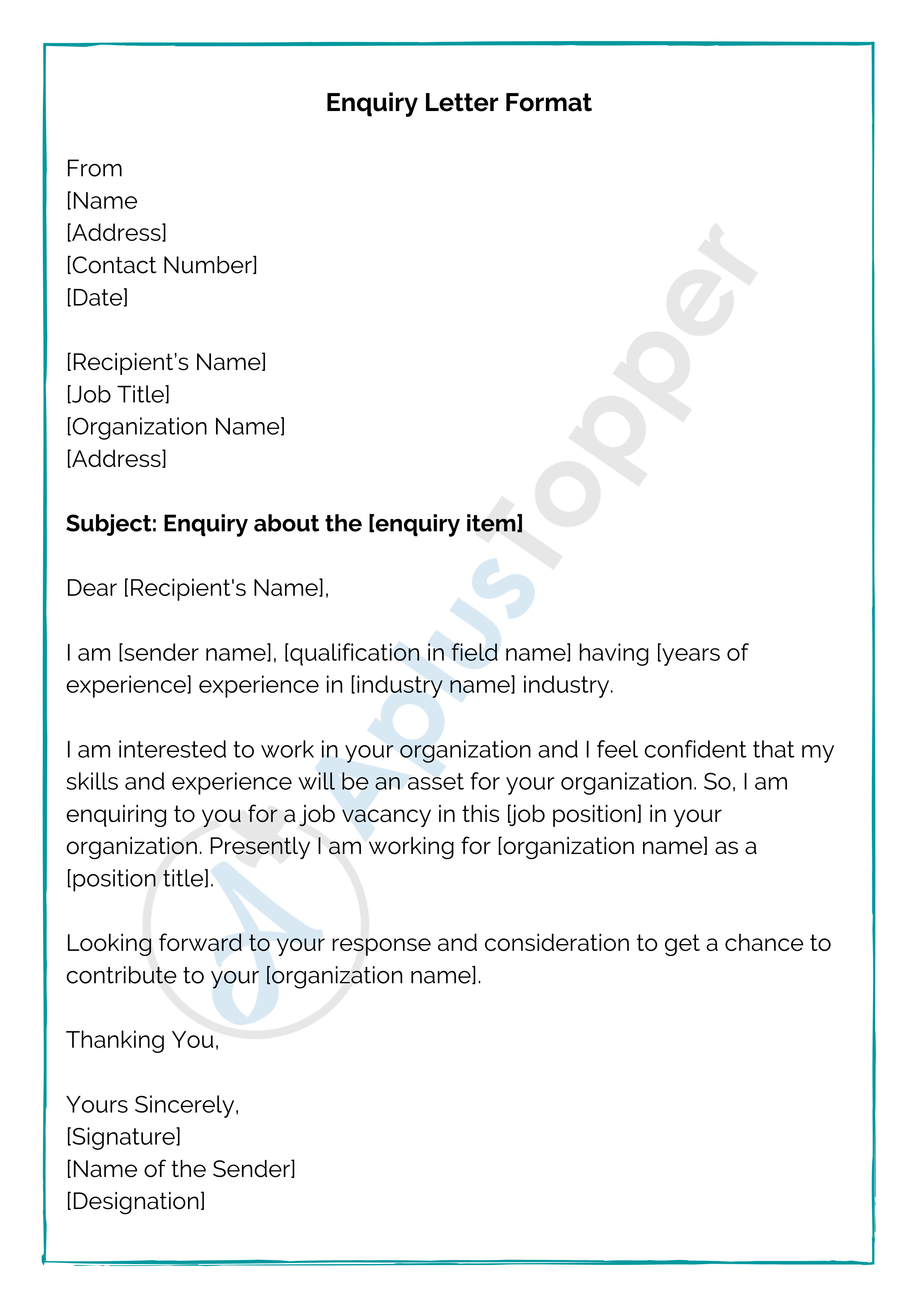 The scope of the letter must include enough information to help the recipient to decide the best response. The sender must mention what is inquiring and which type of favor he/she wants from the recipient in response to the request. Read the complete article below to know more about the letter of Enquiry Format.
