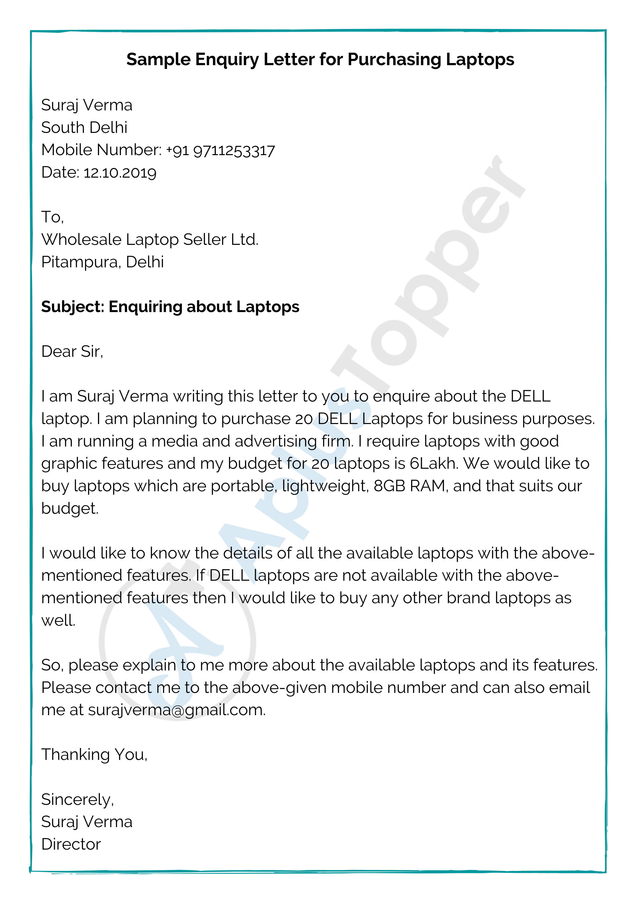 Enquiry Letter: It is a letter written to enquiry the information related to something. It can be written if a person wants to buy an item or wants to go on a trip, etc. The objective of the Enquiry Letter is to make a request to the recipient. In other words, it is written to get the response from the recipient with the action that satisfies the enquiry. The action benefits either the sender or the recipient and sometimes both the parties.