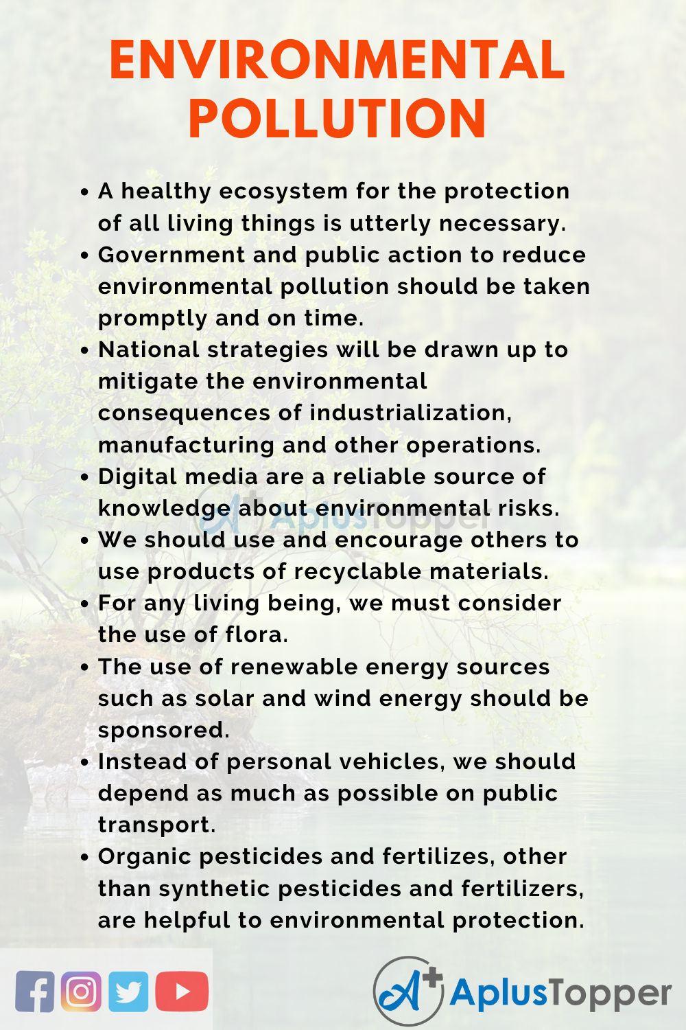 Environmental Pollution Essay: We should treat our Earth’s surroundings as our mother. It nourishes us, too. How can we survive if the climate becomes polluted? For our health and development, the Earth provides us with so many natural resources. Nevertheless, we become more egoistic and tend to pollute our world over time. If our environment becomes more polluted, we do not know that ultimately too, it will affect our health and the future. We will not be able to survive comfortably on Earth.