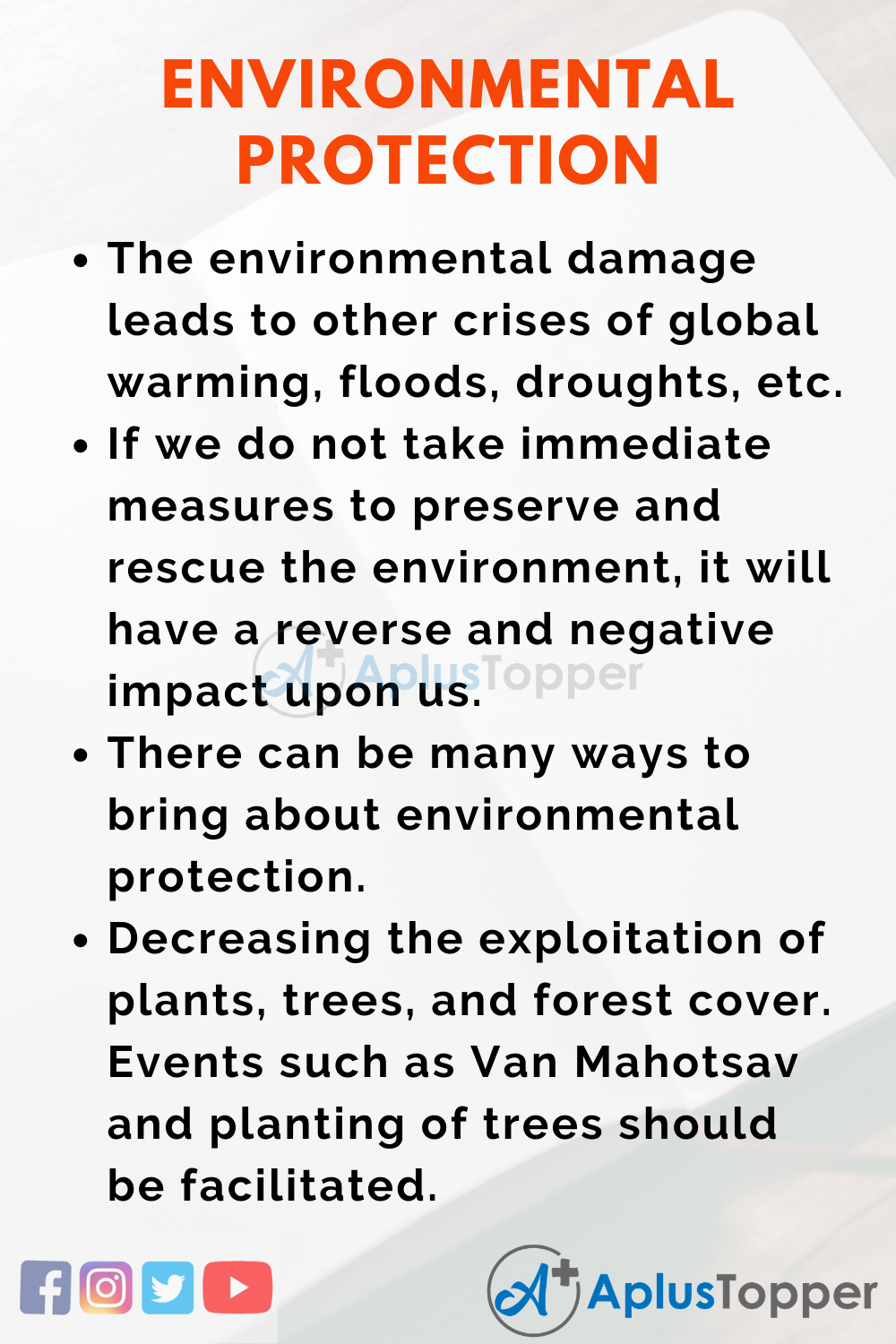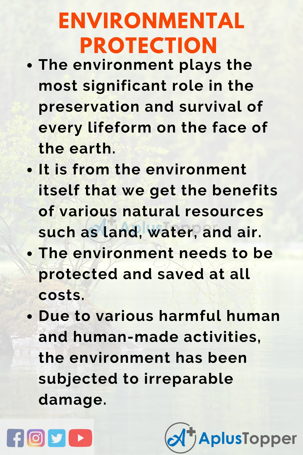 Environmental protection is an important issue because the environment is on its way to degradation. It is also treated as a suitable topic for composition among school students. A set of long and short essays and a set of ten lines on environmental protection has been compiled below. The students can refer to these samples while writing their own essays.