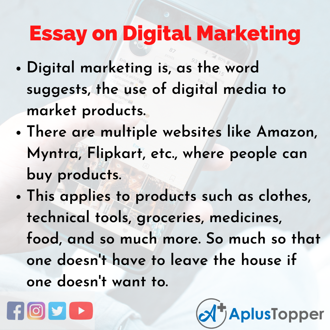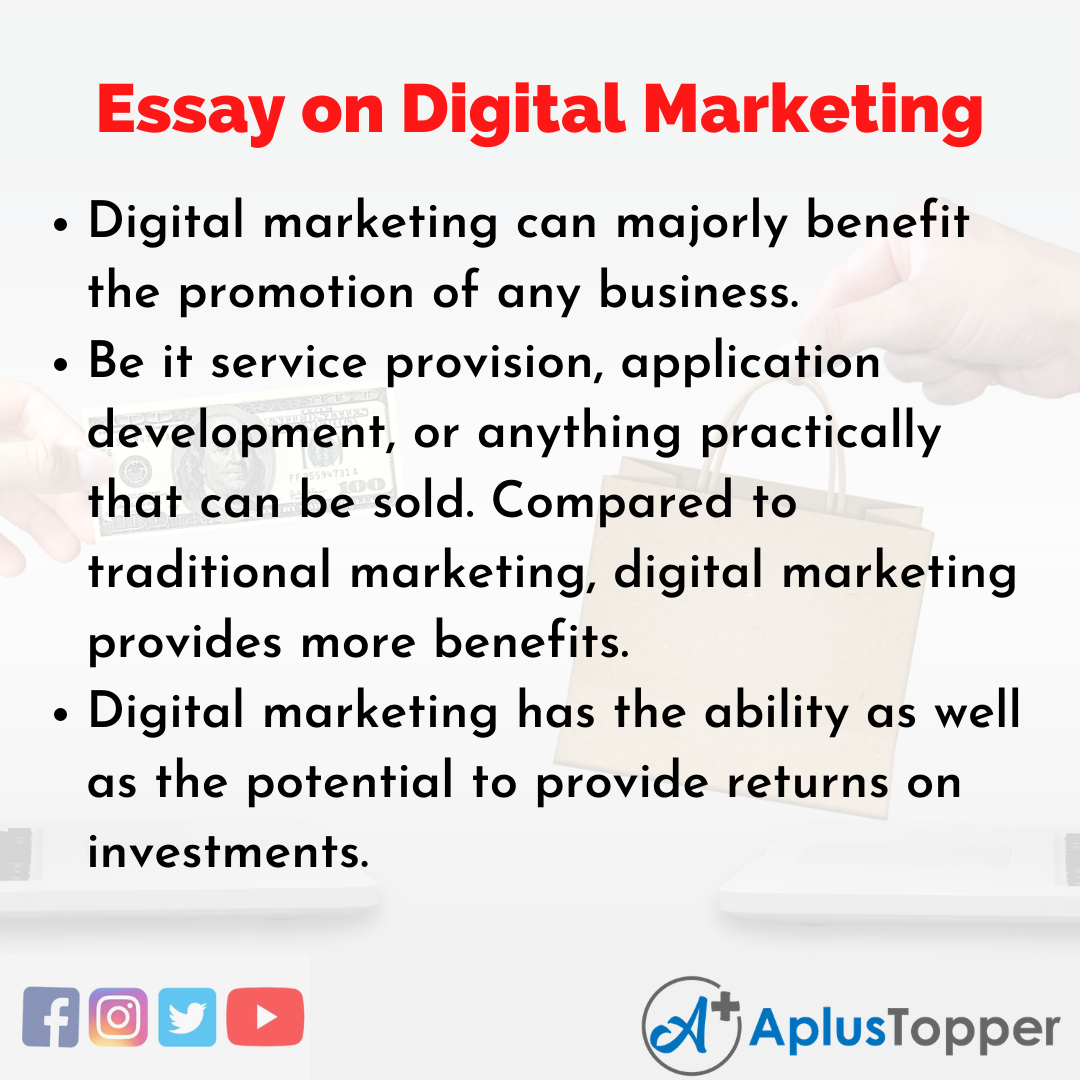 Essay on Digital Marketing: Digital marketing is when any product is promoted through a minimum of one form of electronic media. This form of marketing is vastly different from traditional marketing. Digital marketing consists of various methods and channels that allow any organization or company to have and study this form of marketing to find out what works for them and what does not.