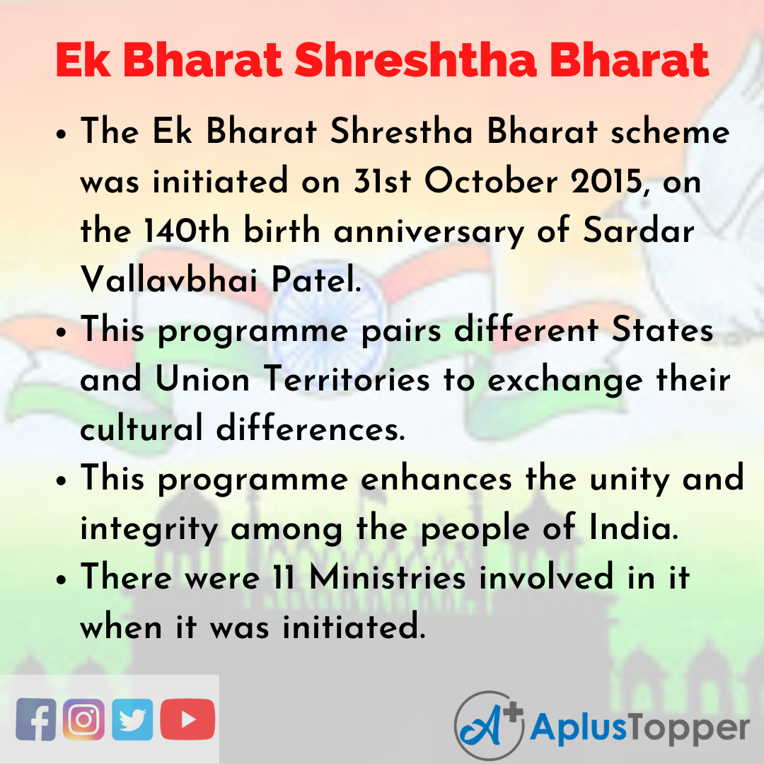 - The Ek Bharat Shrestha Bharat scheme was initiated on 31st October 2015, on the 140th birth anniversary of Sardar Vallavbhai Patel.