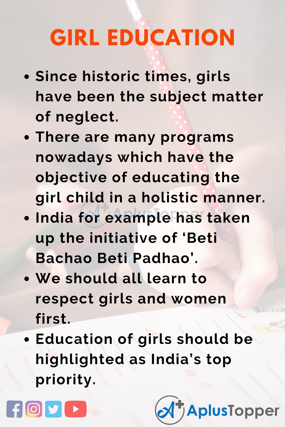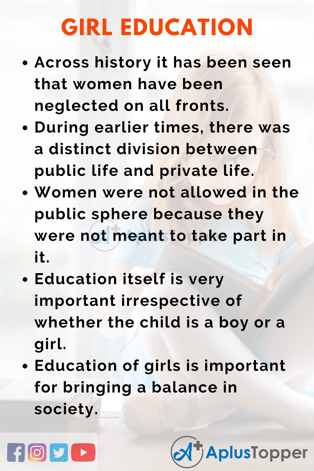 Essay on Girl Education is usually given to classes 1, 2, 3, 4, 5, and 6.