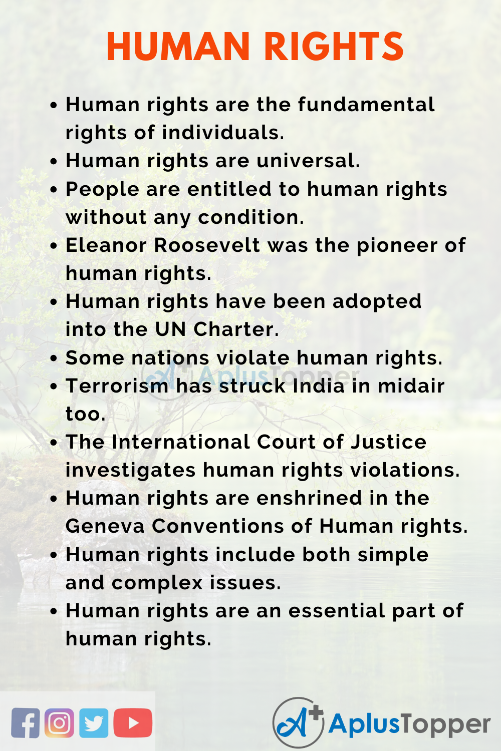 Human rights are a collection of fundamental human freedoms that individuals are entitled to. These rights are not subjected to any conditions. This means that every individual is supposed to have access to human rights. We have written two essays as samples covering the topic for the benefit of students for their exams.