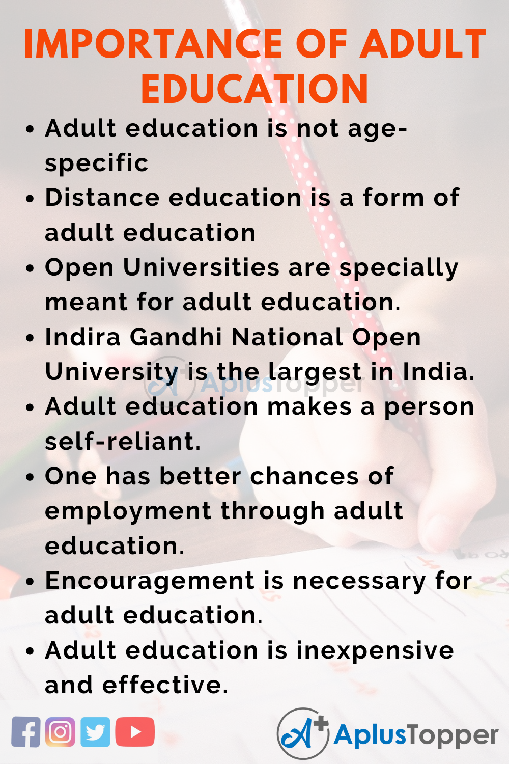 - Adult education makes a person self-reliant.