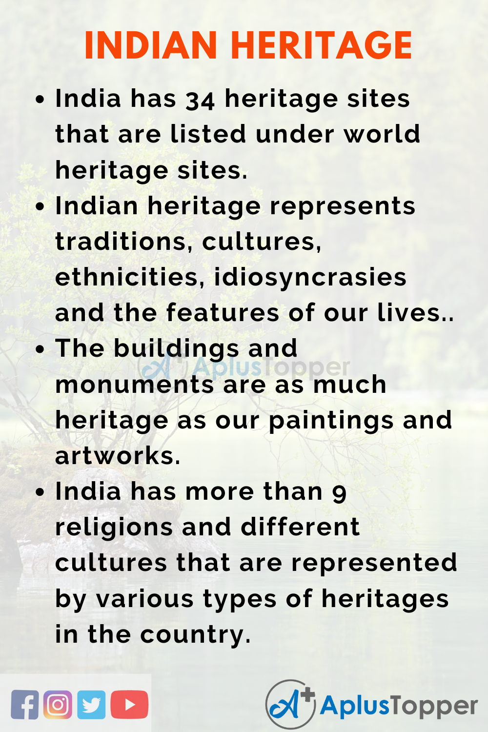 - Indian heritage represents traditions, cultures, ethnicities, idiosyncrasies and the features of our lives.
