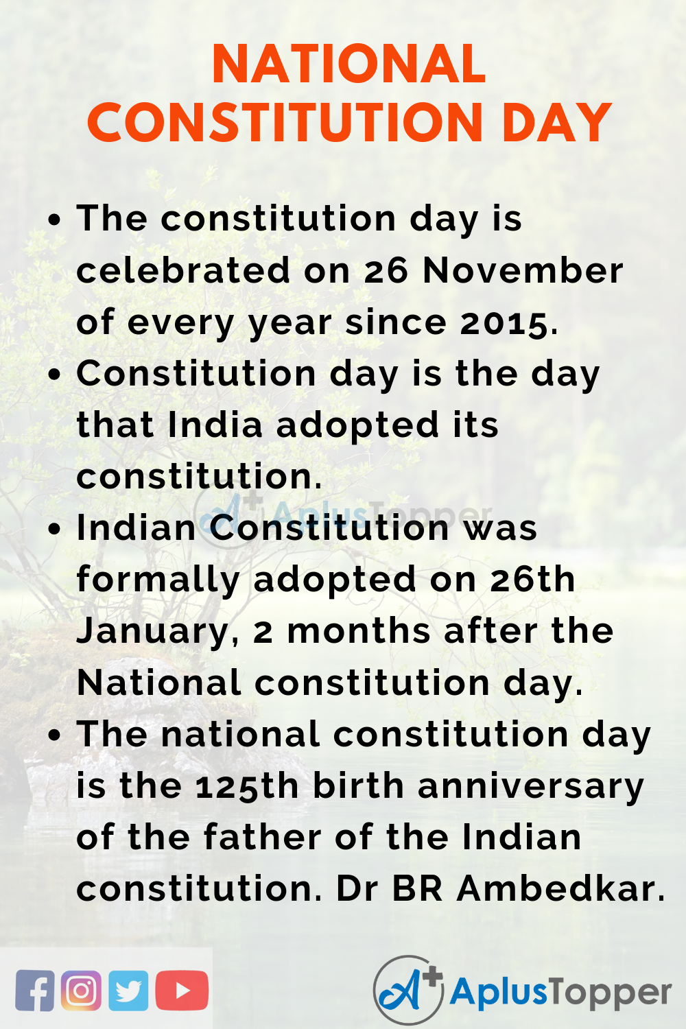 The significance of national constitution day is to celebrate the values of Indian constitution and national constitution day was adopted on 2015 as a part of the 125th birth anniversary of the father of Indian constitution, Dr B.R Ambedkar