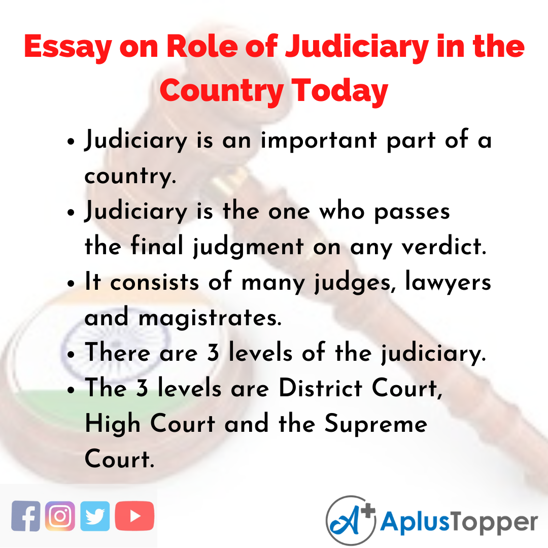Essay on Role of Judiciary in the Country Today: In a country, the judiciary acts as a support system, especially in a democracy. When there is more than one judge present for a group of a state or a country, then it is known as the judiciary. It is very important to have such an authoritative body so that the final verdict can be passed without being unfair to any party. In this essay, we will know the role of the judiciary in our country in the 21st century.