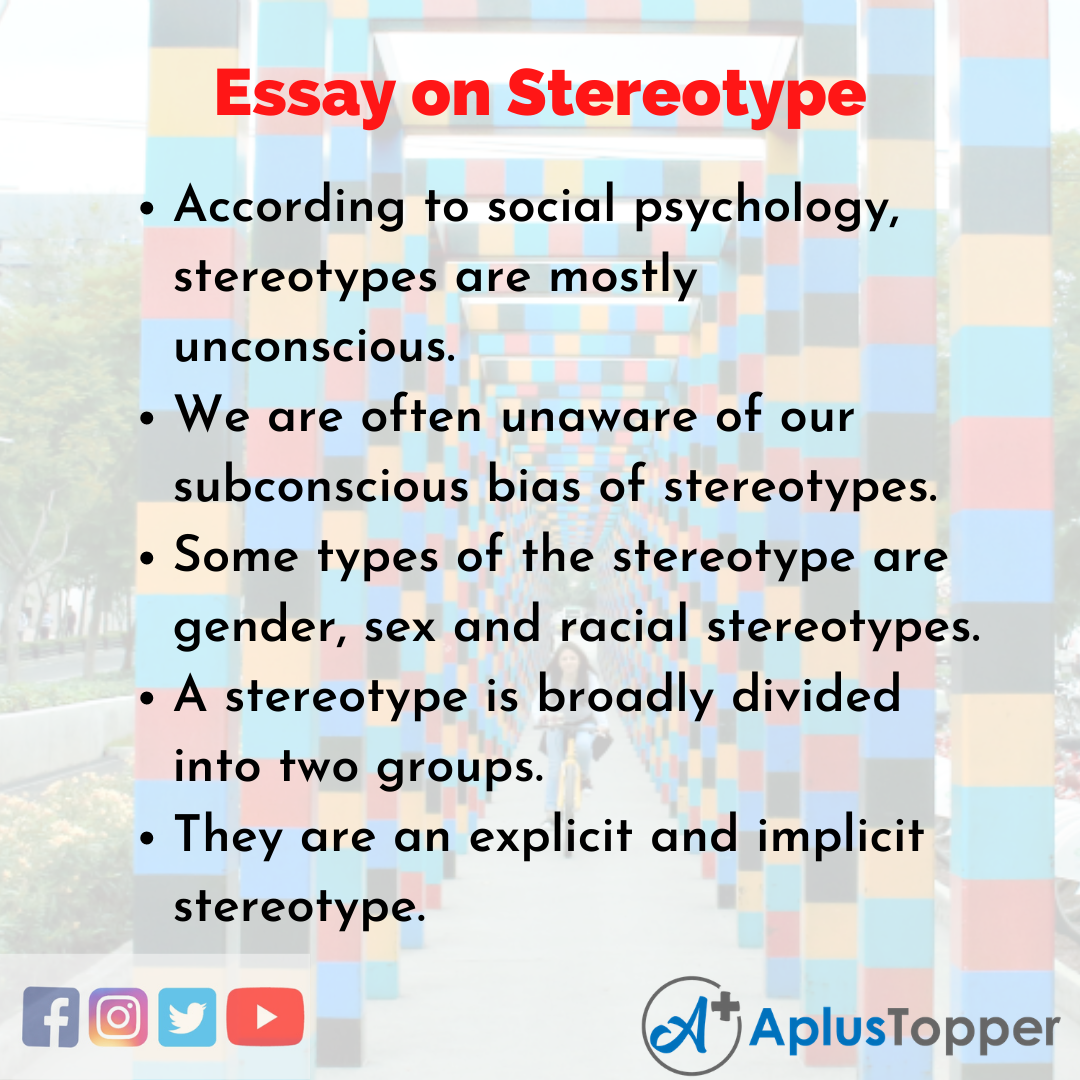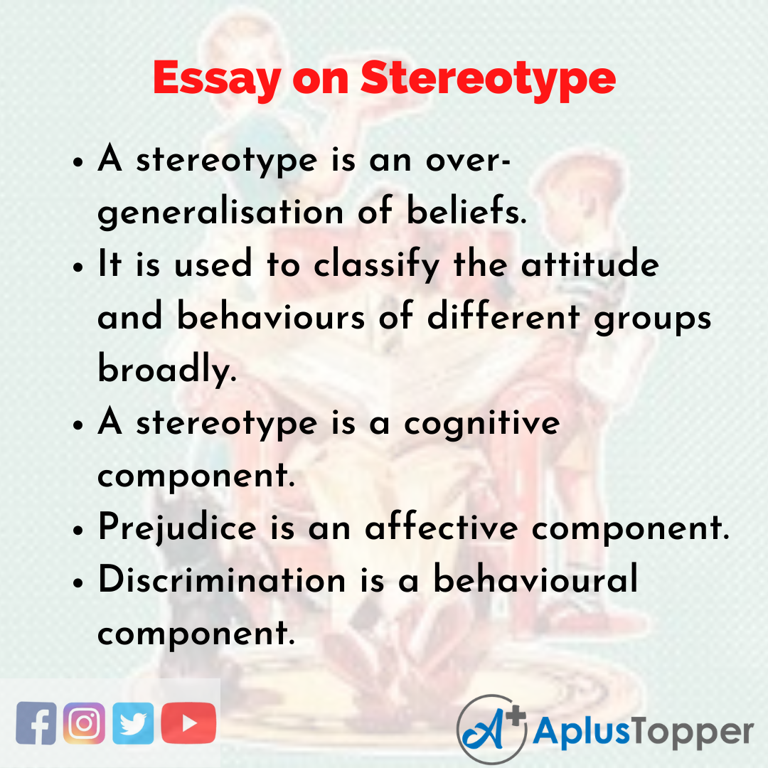 Essay on Stereotype: Stereotype is an extreme generalisation of belief about a particular group o community of people. It is not only a preconceived notion about the certain group but a degree of expectation from the individuals of that group. These expectations are not only centred around a particular belief but also their attitude and personality.