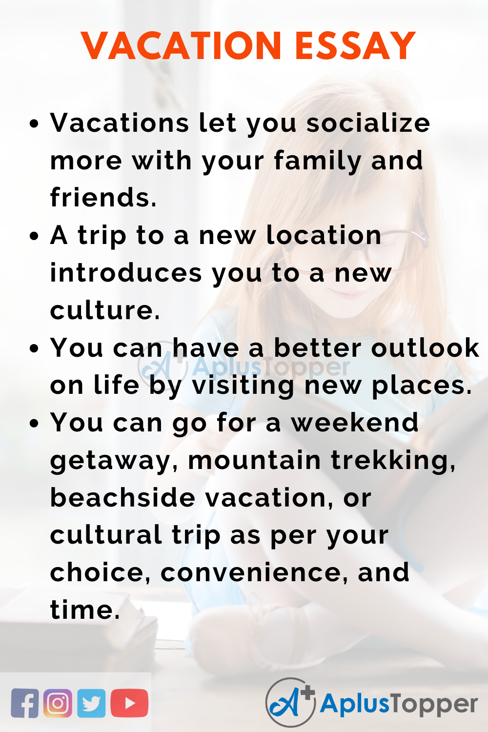Essay On Vacation: A vacation offers everyone a break from work with a chance to relax and recharge oneself. Performing various tasks on a daily basis can stress anybody. It will even directly affect your mental abilities as well as physical stability. Thus, your mind and body will start destressing when you leave your worries behind for a couple of days. Besides, vacation is a few days of fun and pleasure with family or friends.