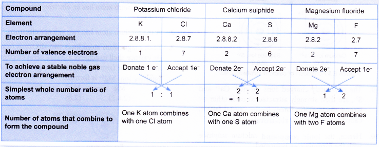 Before you discuss the formation of potassium chloride, calcium sulphide and magnesium fluoride, you need to find out the number of metal and non-metal atoms that will combine with each other to form each of the ionic compounds. This can be done by mental mapping as below: