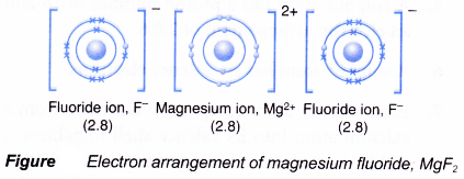- Hence, the ionic compound magnesium fluoride with the electron arrangement as shown in above figure is formed. This compound has the formula MgF2.